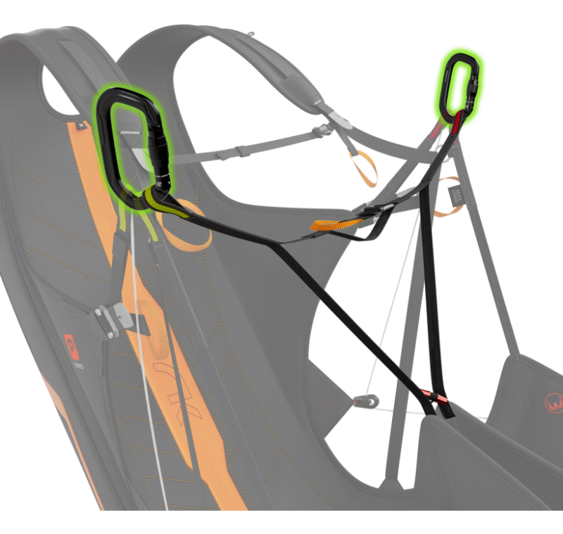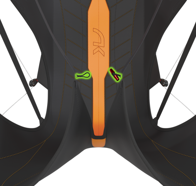 Quando si utilizza solo il telaio dell’imbrago, la clip metallica rossa tra le gambe può essere facilmente aperta per offrire maggiore comfort e libertà di movimento durante il ground handling o il volo in dinamica. Lasciando la clip sganciata, le gambe possono muoversi liberamente. Tuttavia, durante il volo con l’imbrago completo, si consiglia di mantenere questa clip chiusa per garantire maggiore stabilità, comfort ottimale e una lunga vita operativa.