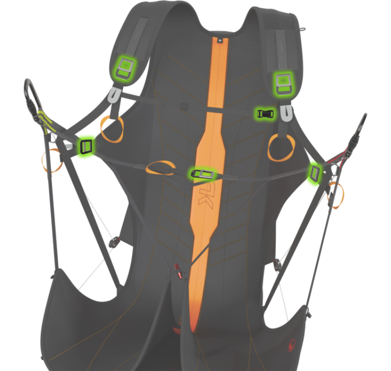 La cinghia pettorale e i cosciali sono collegati tramite un’unica fettuccia che si aggancia direttamente ai moschettoni. Questo sistema di chiusura è semplice e pratico, rendendo così facile indossarlo. Il pilota può scegliere se entrare nell’imbrago oppure aprire e chiudere i moschettoni a ogni utilizzo.