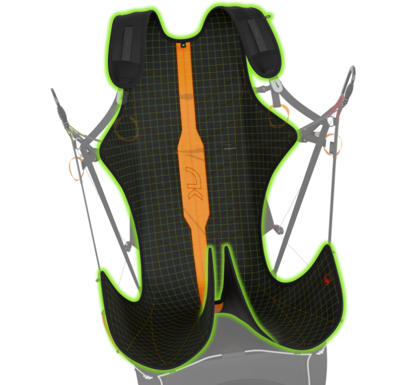La struttura del KOOPER P è stata modellata in 3D per garantire la migliore ergonomia possibile. I cosciali assicurano stabilità e comfort in volo. Il design dello schienale è stato ottimizzato con una schiuma compatta che offre un eccellente supporto. Questo design consente maggiore libertà di movimento e una vestibilità naturale sul corpo del pilota.